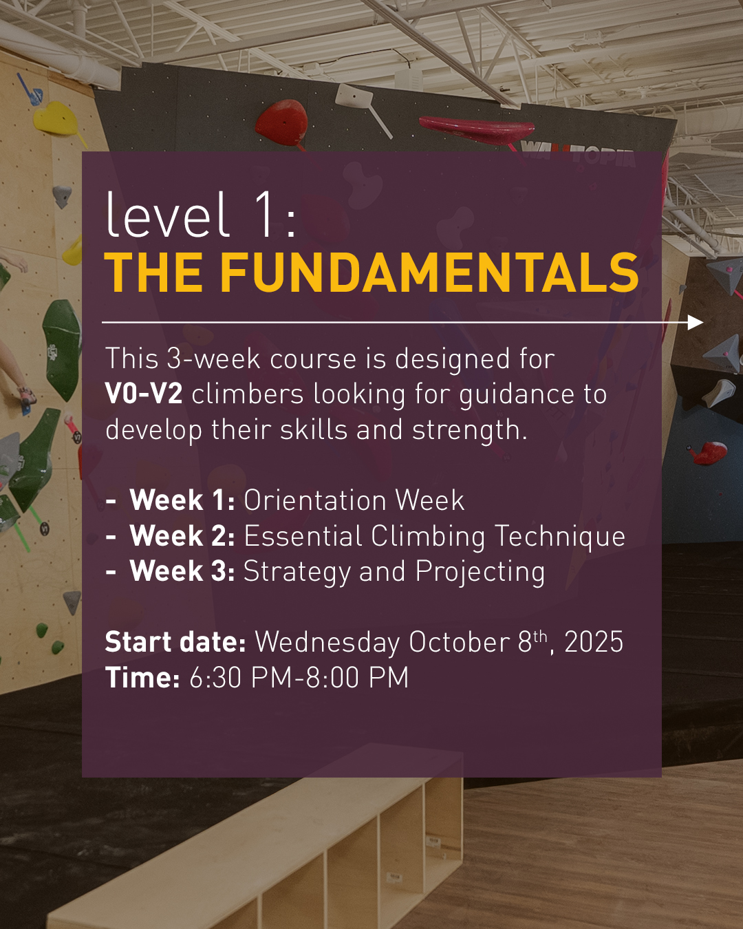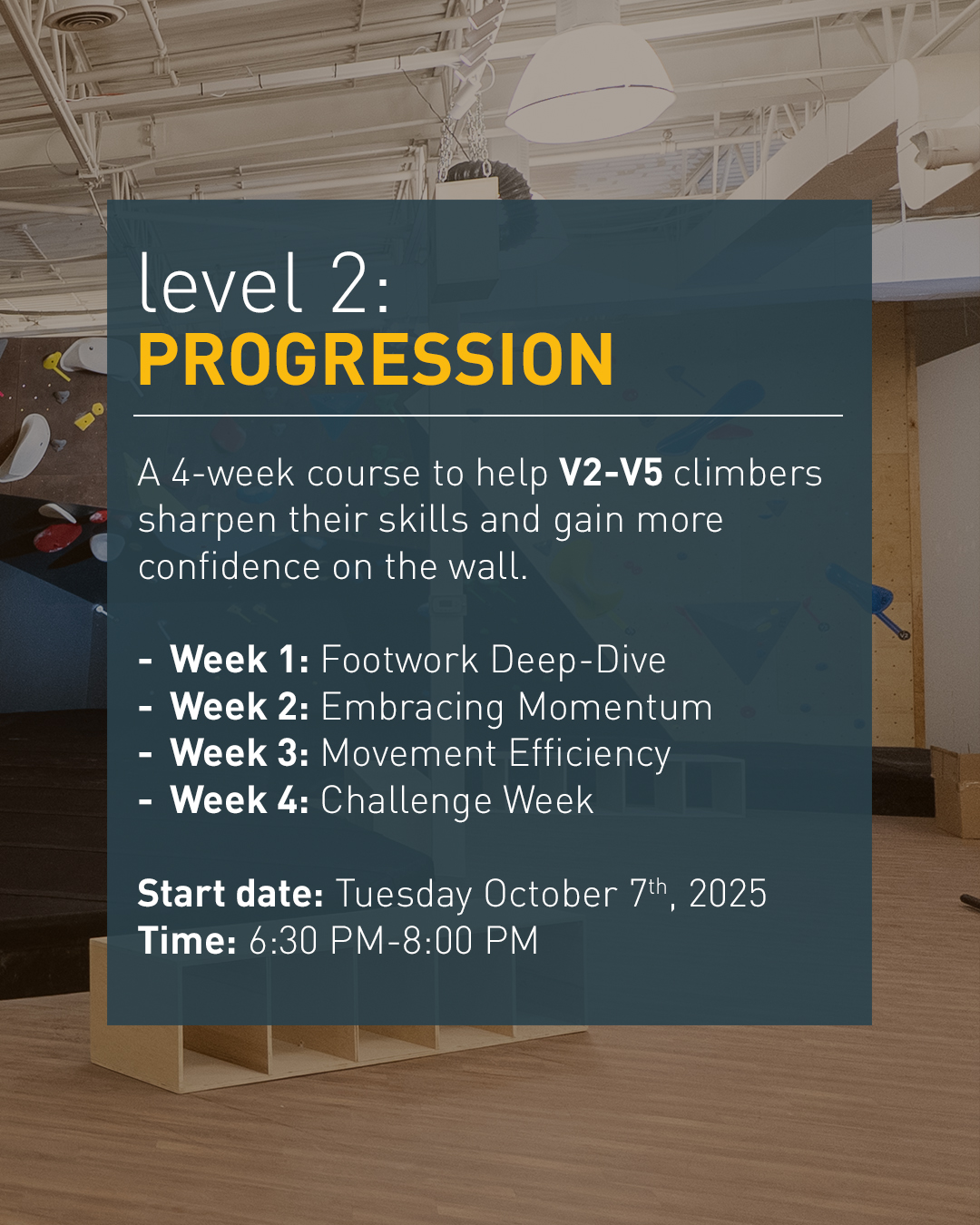 A 4-week course to help V2-V5 climbers sharpen their skills and gain more confidence on the wall. Week 1: Footwork Deep-Dive Week 2: Embracing Momentum Week 3: Movement Efficiency Week 4: Challenge Week Start date: Tuesday October 7th, 2025 Time: 6:30 PM-8:00 PM
