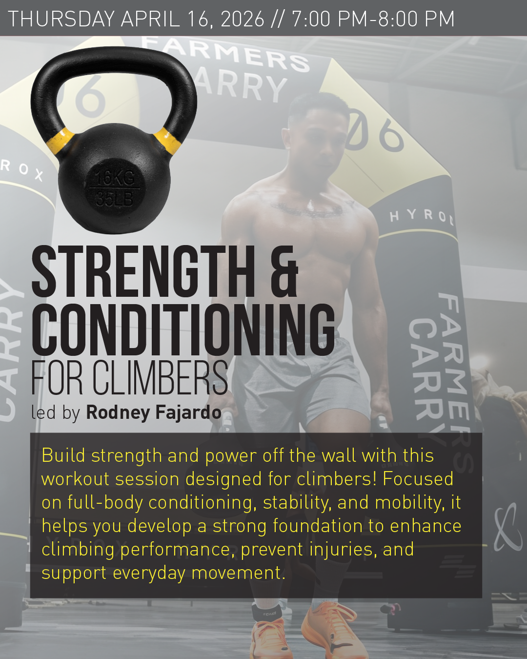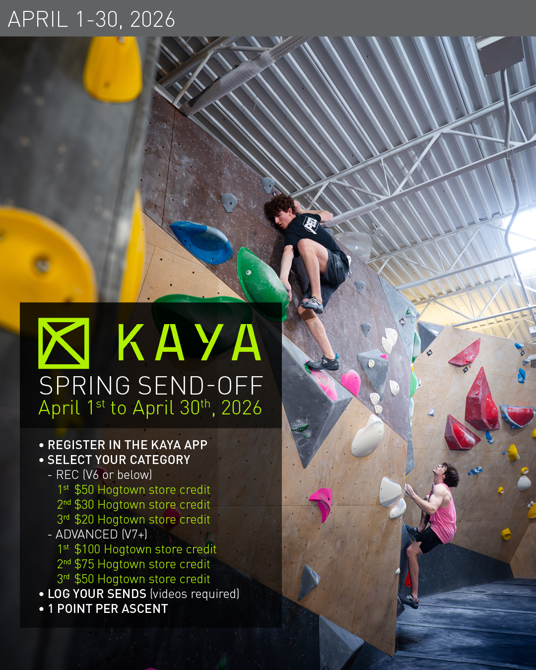 Get strong for Spring! REGISTER IN THE KAYA APP SELECT YOUR CATEGORY REC (V6 or below) 1st $50 Hogtown store credit 2nd $30 Hogtown store credit 3rd $20 Hogtown store credit ADVANCED (V7+) 1st $100 Hogtown store credit 2nd $75 Hogtown store credit 3rd $50 Hogtown store credit LOG YOUR SENDS (videos required) 1 POINT […]