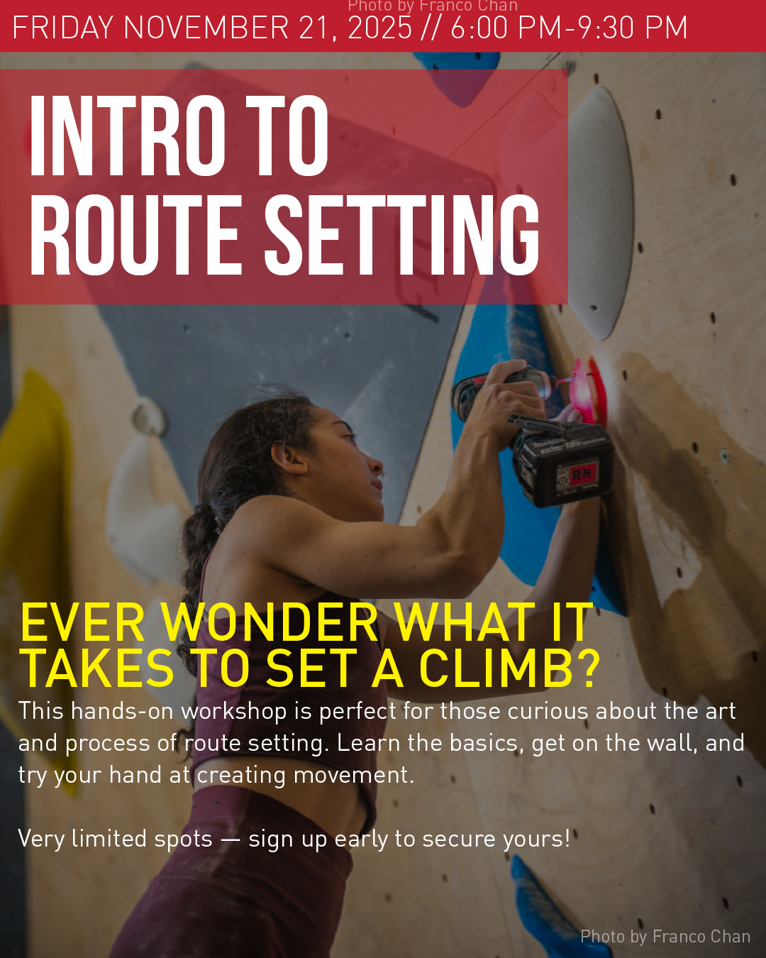 Intro to routesetting Set Your First Boulder. Learn the Craft. Get Creative. This hands-on workshop offers a unique look into the world of route setting—what goes into building the climbs […]