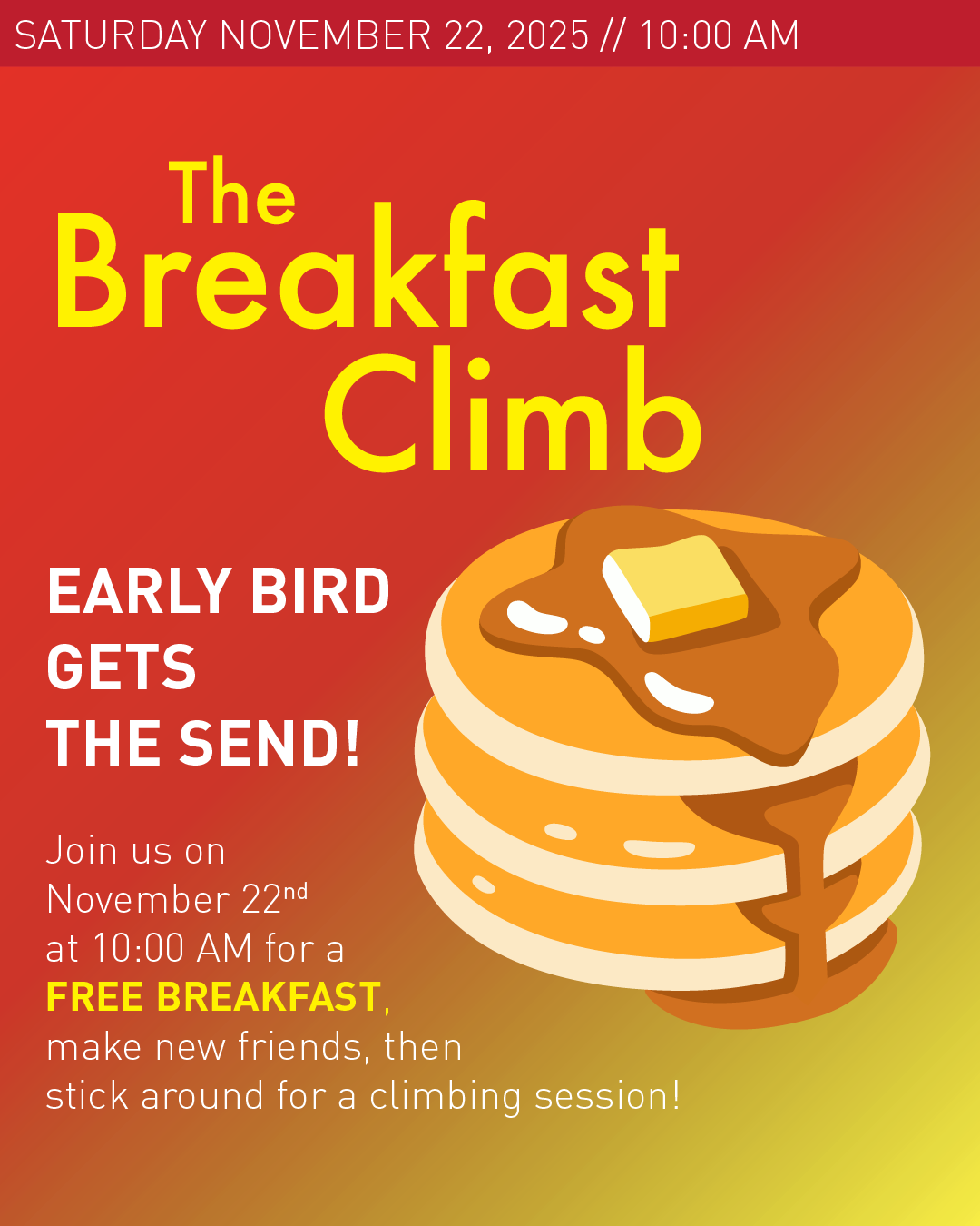 EARLY BIRD GETS THE SEND! Join us for a FREE BREAKFAST, make new friends, then stick around for a climbing session!