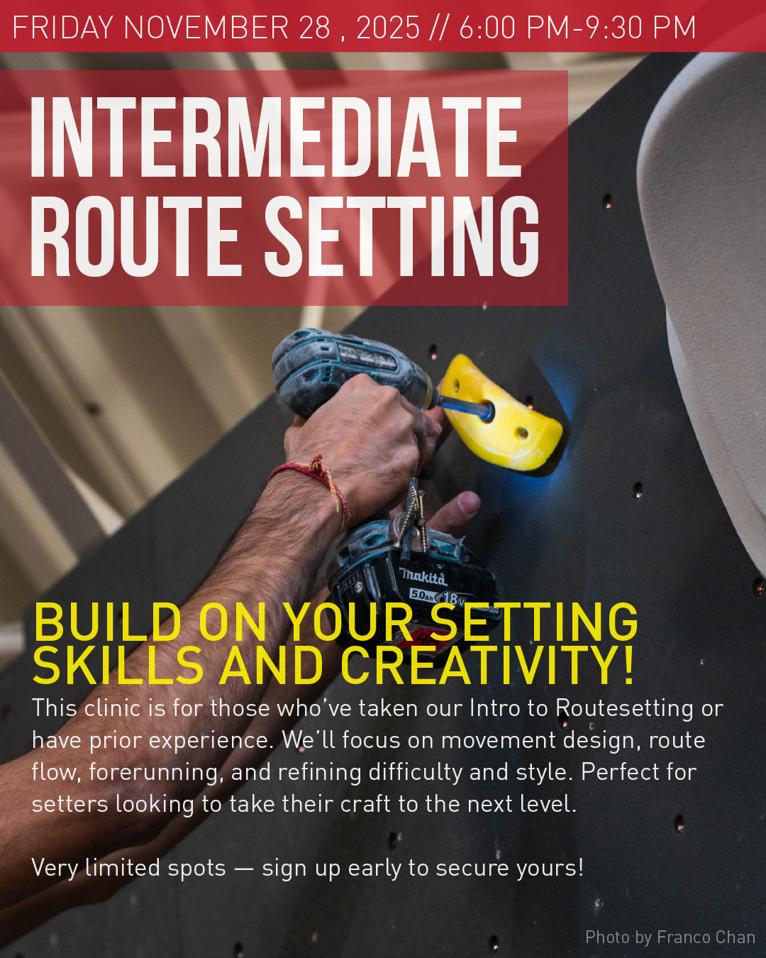 Intermediate routesetting clinic BUILD ON YOUR SETTING SKILLS AND CREATIVITY! This clinic is for those who’ve taken our Intro to Routesetting or have prior experience. We’ll focus on movement design, […]